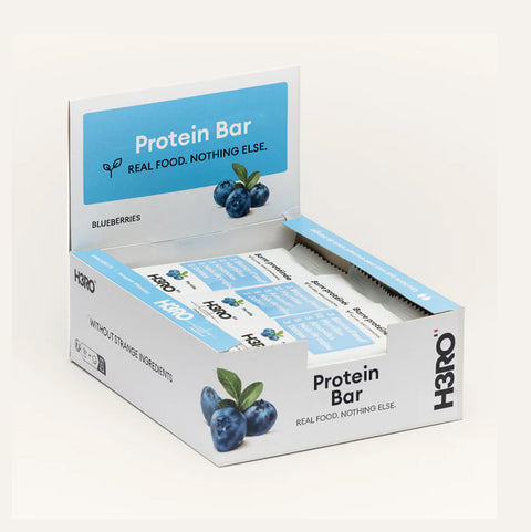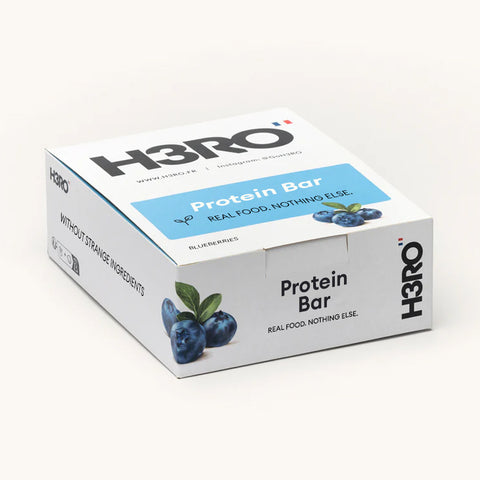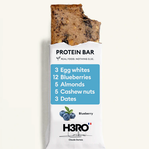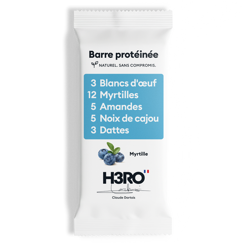 12 myrtilles entrent dans une barre . Ce n'est pas une blague — c'est votre nouvelle barre protéinée préférée. Voici H3RO Myrtille, la barre saine et irresistible, fabriquee avec seulement quelques vrais ingrédients, et exactement 12 myrtilles entières dans chaque barre. Oui, nous avons compté.